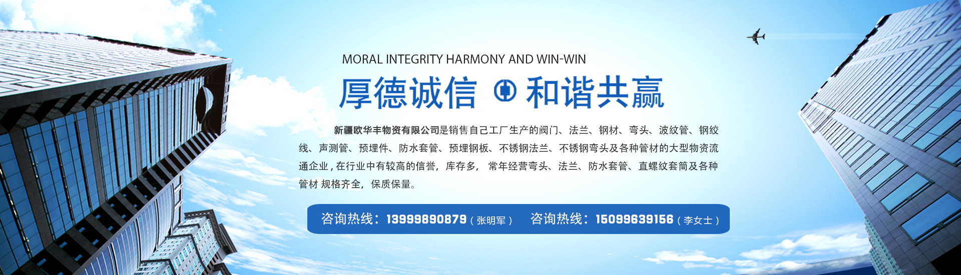 新疆歐華豐物資有限公司是銷售自己工廠生產(chǎn)的彎頭  法蘭  防水套管  及各種管材的大型物資流通企業(yè) , 在行業(yè)中有較高的信譽(yù),庫(kù)存多,常年經(jīng)營(yíng)閥門(mén)、法蘭、鋼材、彎頭、波紋管、鋼絞線、聲測(cè)管、預(yù)埋件、防水套管、預(yù)埋鋼板、不銹鋼法蘭、不銹鋼彎頭及各種管材 規(guī)格齊全,保質(zhì)保量。 公司一貫以: 服務(wù)上乘、質(zhì)量?jī)?yōu)質(zhì)、價(jià)格合理、客戶至上、服務(wù)周到、讓利客戶、薄利多銷為原則,誠(chéng)實(shí)守...